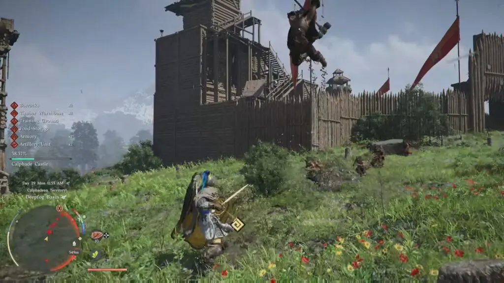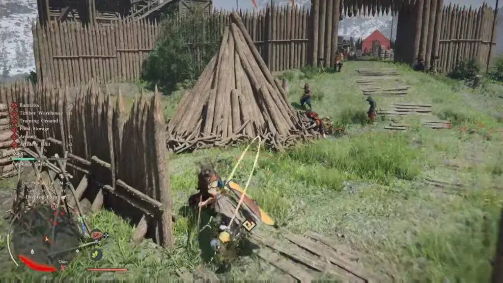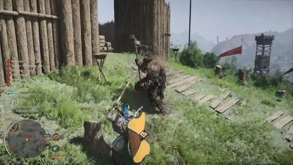 • Raise your shield immediately. He will perform a three-hit attack combo. Block the first two hits, then dodge on the third attack. Afterwards, he will retreat inside the camp.