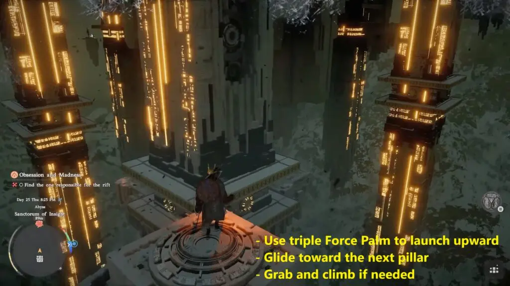 Next, the objective is to reach the building at the top of a tall pillar. Move forward to the platform ahead and stand near the edge. Jump off and use Force Palm downward three times in quick succession to build upward momentum. Once you have gained enough height, transition into a glide and aim for the first pillar. Even if you don’t land perfectly on top, you can grab onto the side of the pillar and pull yourself up.