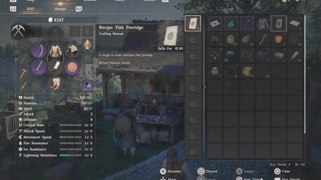 After speaking with her, open your inventory, go to the Crafting Manual, and select the Fish Porridge recipe to learn it. Items required to prepare the dish are Lentils, Fish fillets, salt, and water.