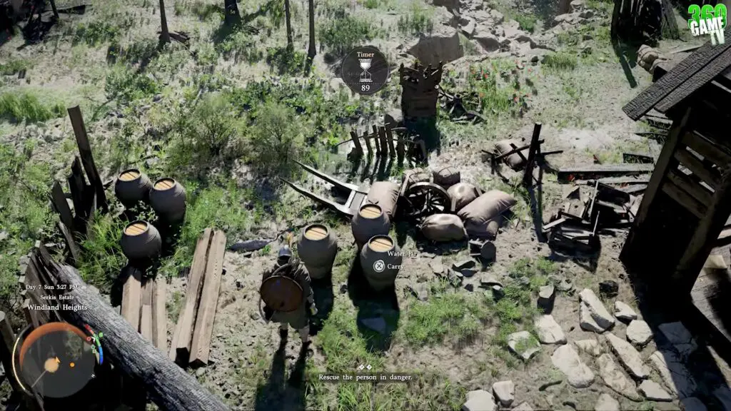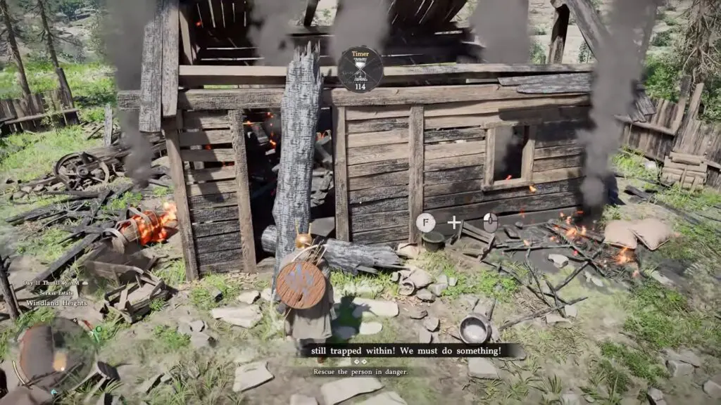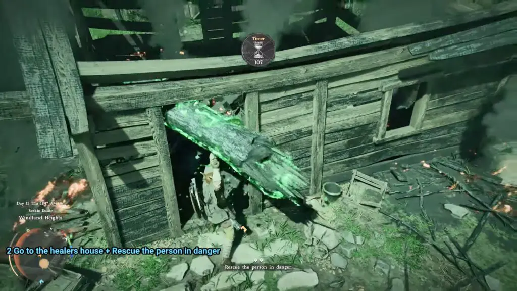 Now, your task is to save this man. You’ll be given a time limit of about 120 seconds to rescue him. To enter the hut, use Nature’s Grasp to lift and remove the two large logs blocking the doorway. Once the path is clear, you can move inside and continue the rescue.
