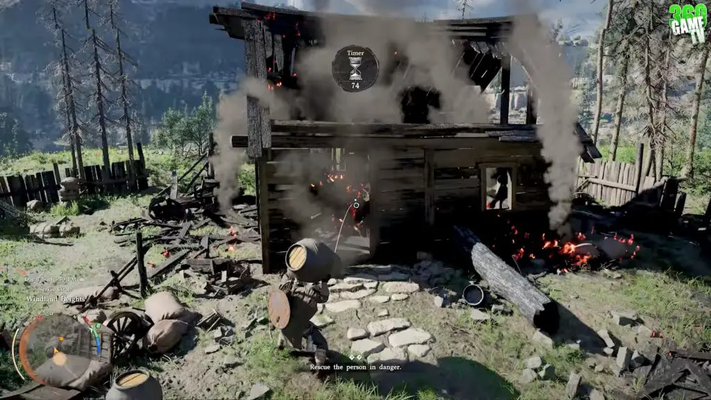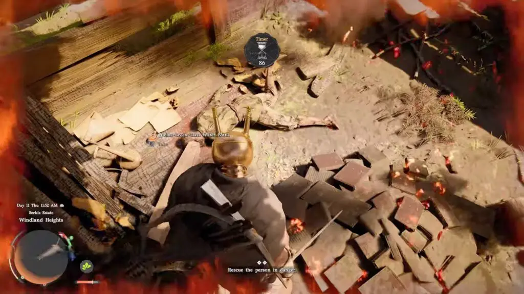 Once the entrance is cleared, head inside the burning building. Even after removing the logs, the inside of the building is still filled with fire and smoke, making it harder to move around. If you act quickly and have enough time, you can reduce the danger by using the water jars placed outside the building.