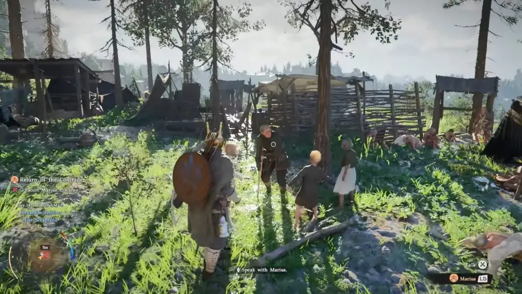 Marius is located at a camp in Scrapfold. Once you reach there, you will find him surrounded by beggars. Avoid getting close to beggars and wait for them to leave Marius alone, else you have to pay coins to them.