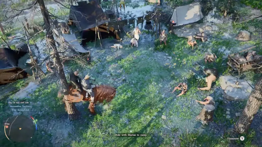 Now begin riding back to your camp. Ride slowly and steadily. Do not go too fast, or Marius might fall off the horse. Your horse can go down small drops safely, but avoid big jumps because it can knock you off. It is best to stay on the main path and not take dangerous shortcuts.