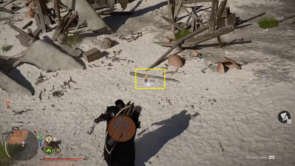 Head to the northern edge of the search area. It is in the sand in front of the shipwreck. Look for a small wooden pole sticking out of the sand. The Talisman is located right next to it.