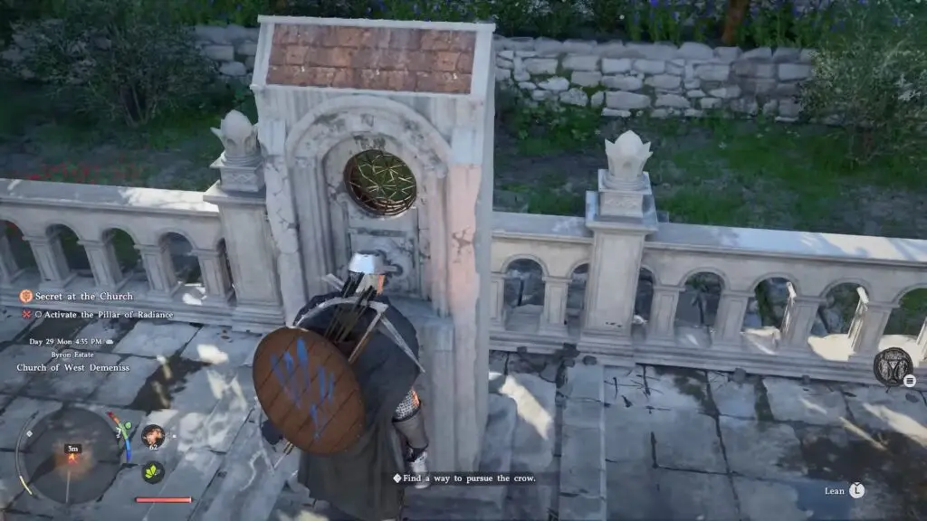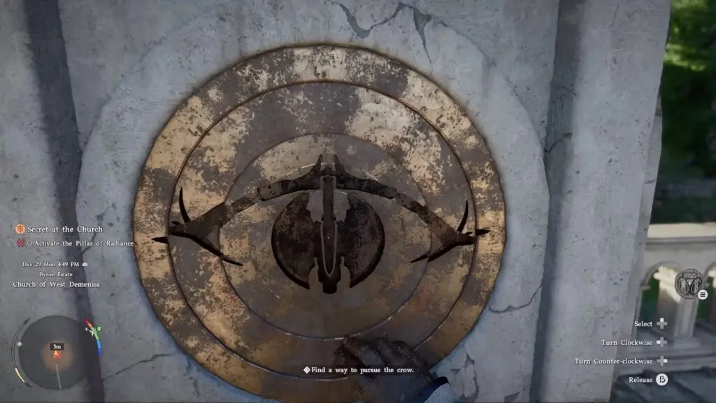 After obtaining the relic, exit the cellar and make your way back to the Pillar of Radiance, located between the church and the orphanage. Look at the pillar using LB and interact with X to trigger the mechanism. This will make the pillar rise from the ground and reveal a puzzle.