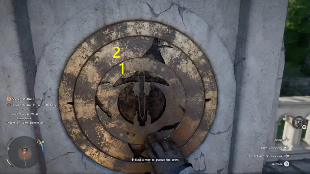 After activating the pillar, you will be able to examine a rotating disc puzzle that consists of multiple layered rings. Each layer can be selected and rotated separately, so you will need to work through them one at a time.
