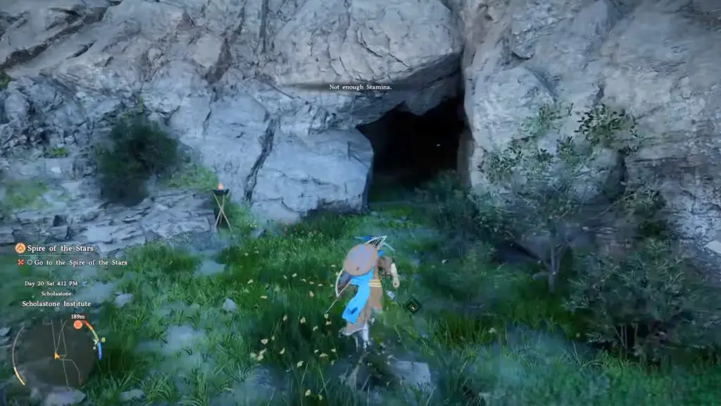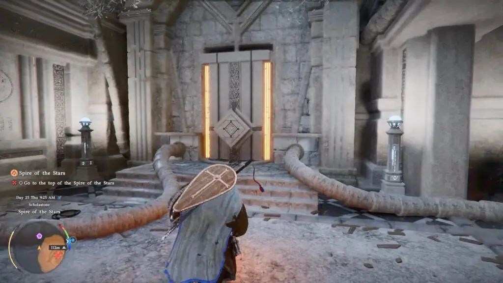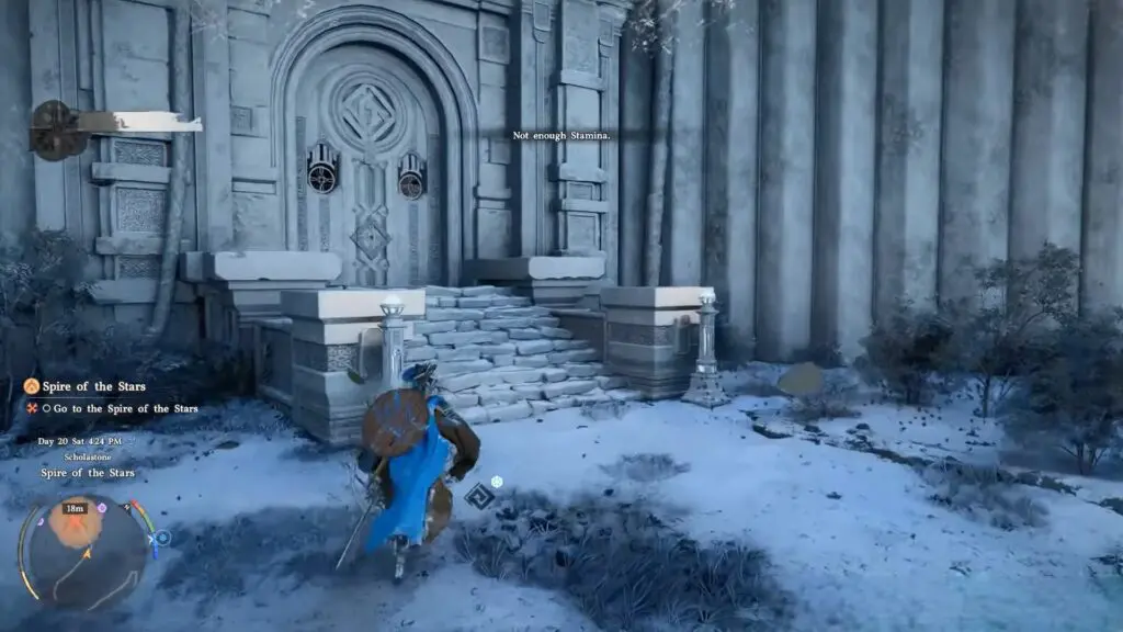 Climb the stairs, and you will enter a cave. Walk straight through the cave, and then keep following the stairs as they go higher and higher. At the top, you will find a big stone door. Interact with it to enter the Spire of the Stars.