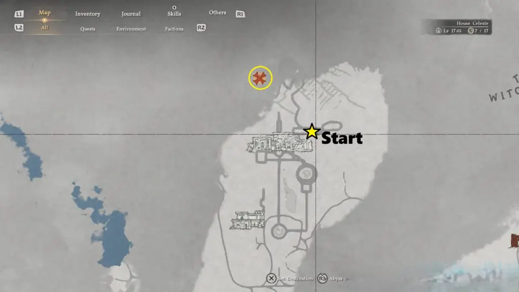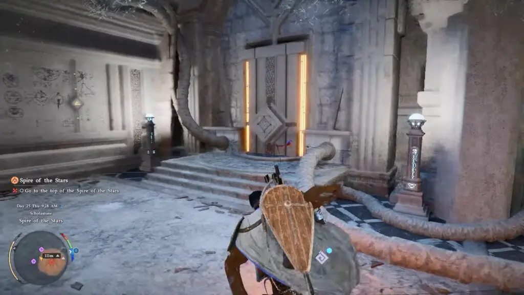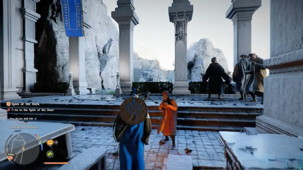 As the quest begins, your task is to reach the Spire of the Stars. From the starting point, go to the north-east side of the Scholastone Institute. Follow the road until you see a staircase going up.