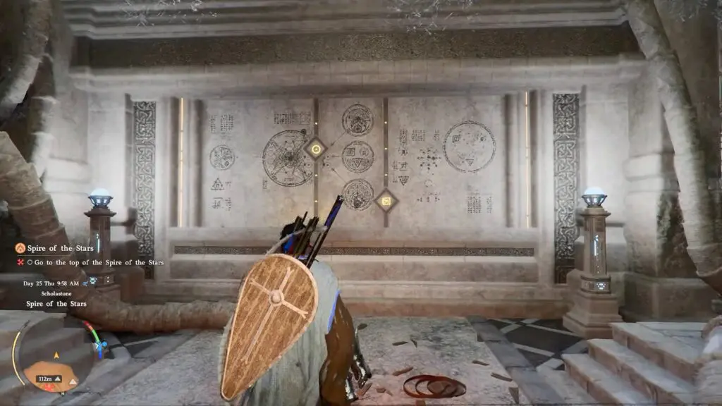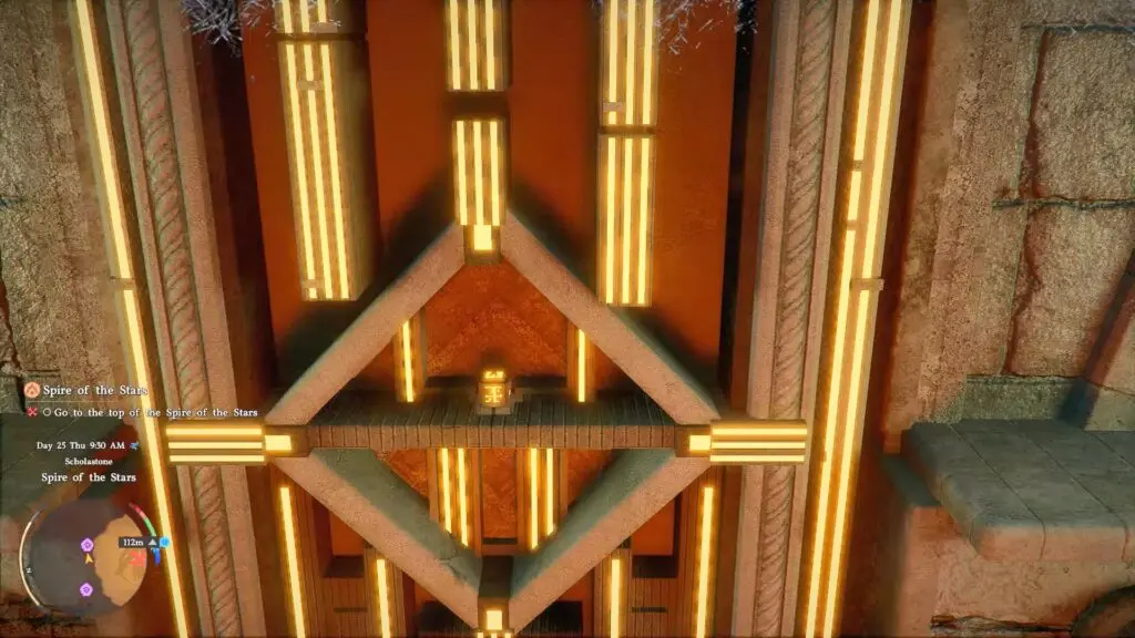 Once all symbols are correctly aligned, the system will activate automatically and power on the lift in the center. Step onto the middle platform, and it will carry you up to the top of the Spire.
