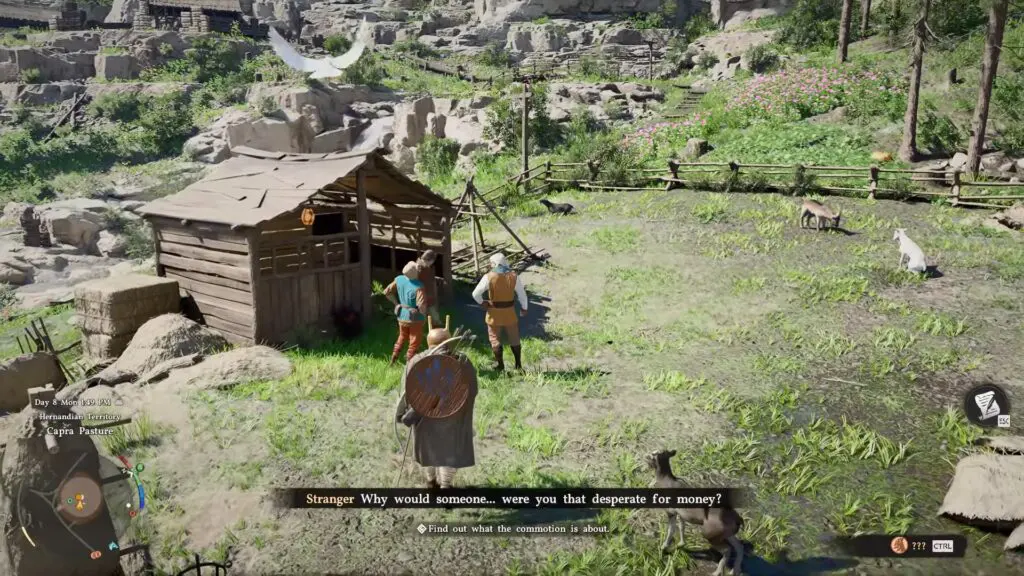As the quest begins, head southwest from Hernand City and follow the marker on your map to reach a ranch. There, you’ll meet an NPC named Ibano. Speak with him to learn that bandits have cut off the valuable horns of his goats.
