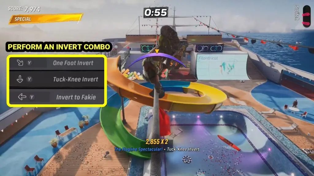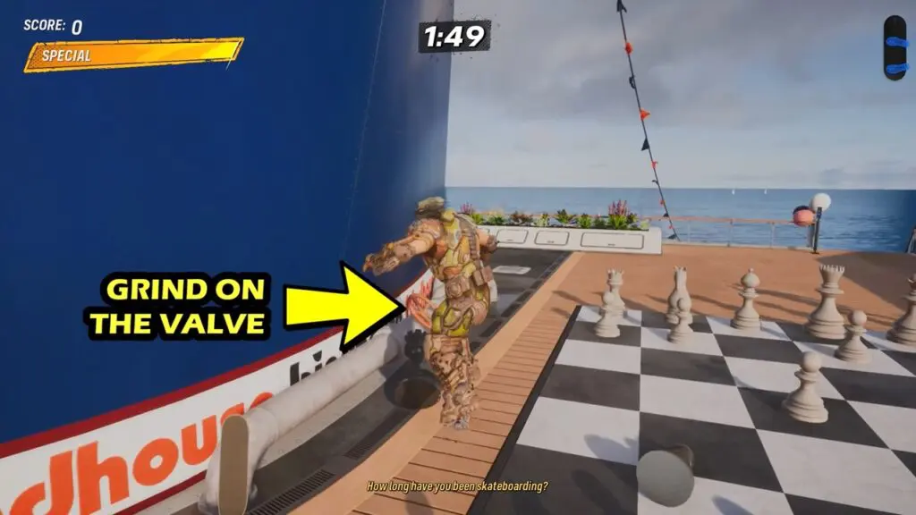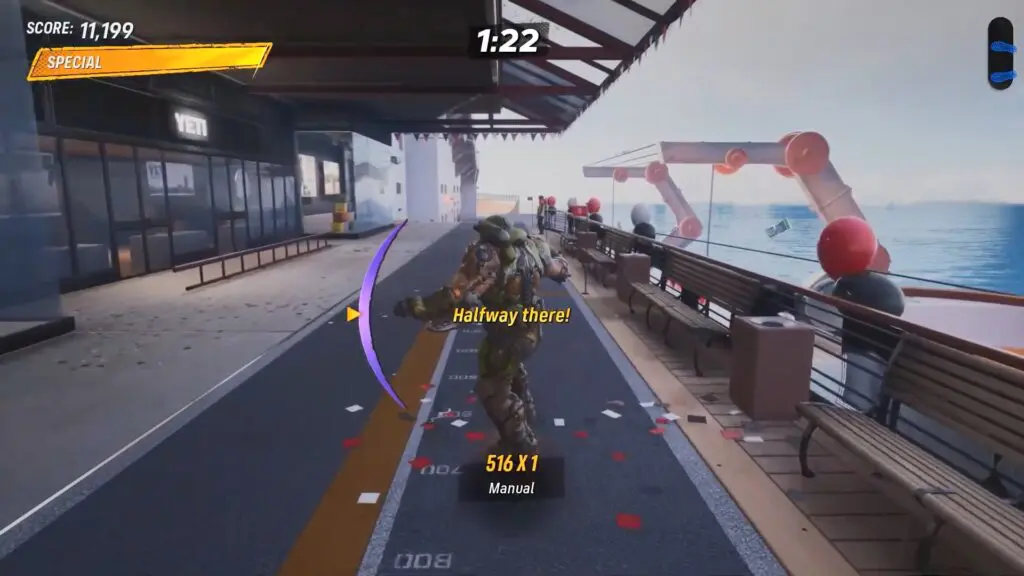 The second stunt needs to be performed on the left side of the ship, near the shop area. To complete this stunt, you need to perform a balancing act on either the front or back wheels of your board and the entire row of shops without falling.