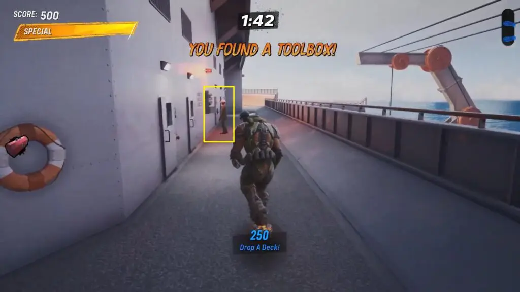Look for an edge you can drop down from. When you drop down, you’ll find a ramp with a red toolbox sitting on it.