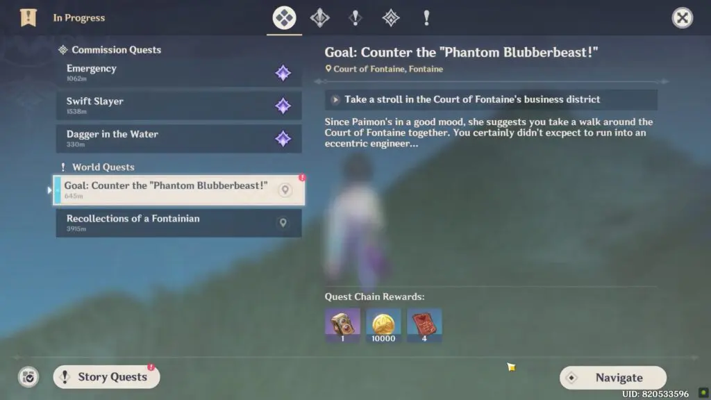 To initiate the world quest titled “Goal: Counter the ‘Phantom Blubberbeast,'” proceed to the Fountain Court and engage in conversation with Lepine-Pauline.