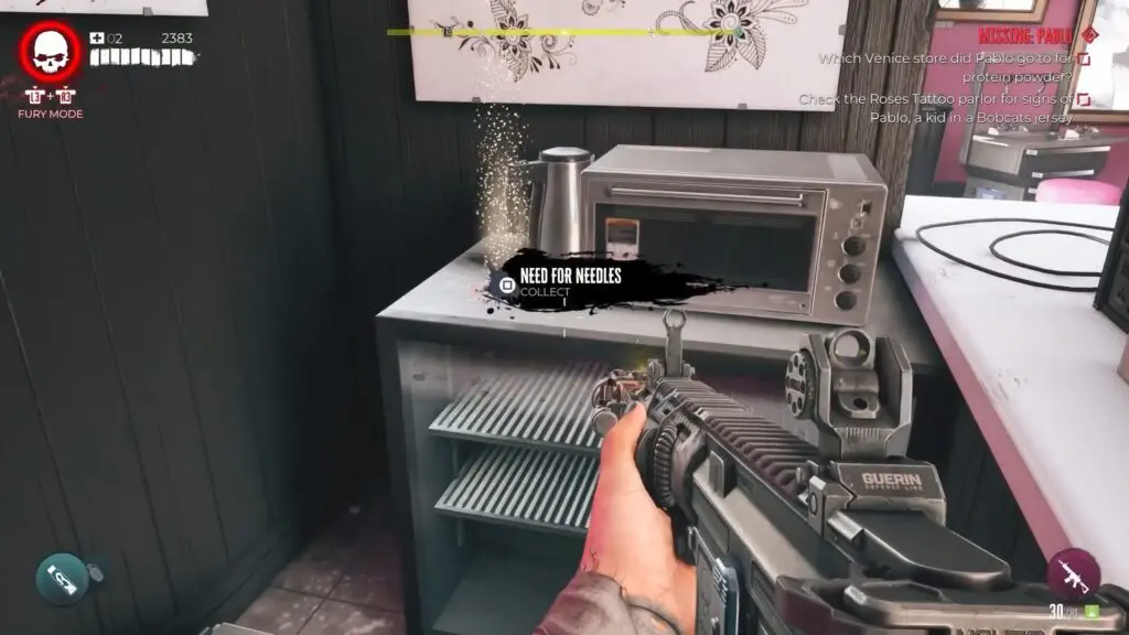 To find the insulin needles, make your way to the Roses Tattoo parlor located in Venice Beach. Use the button on the wall to lift the gate and proceed to the counter to obtain the Journal titled “Need for Needles.”