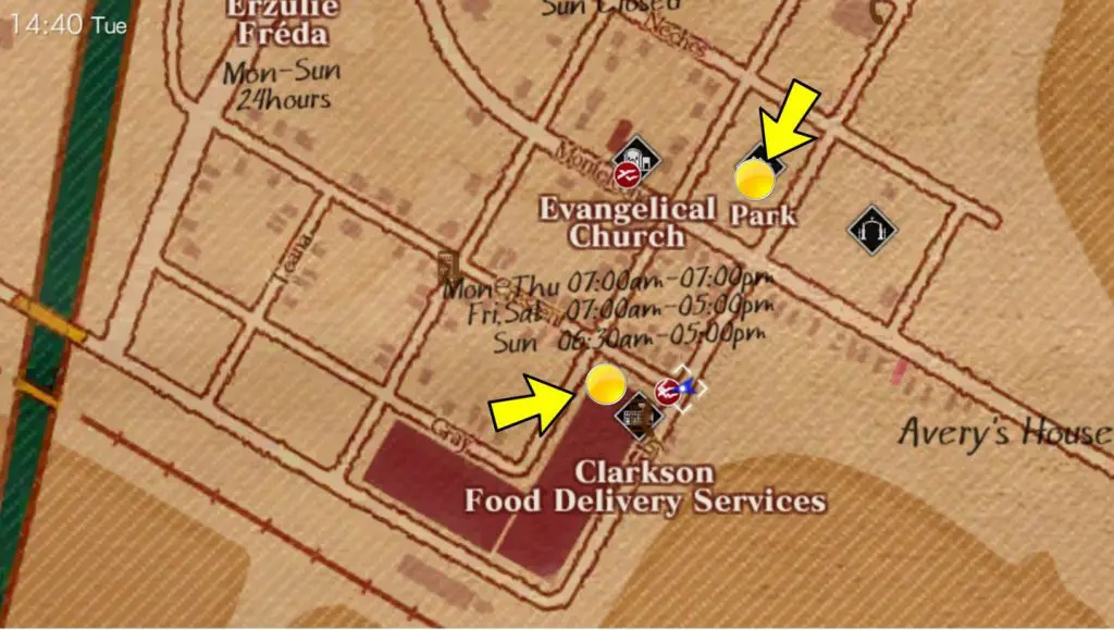 Avey’s Location: Outside the Clarkson Cold Storage building in the afternoon, or in the Park which is on the right side of the Church in evening [TIP: to know the exact location of a NPC, fully zoom the map. The map will start showing the NPCs: Blue dots with name].
