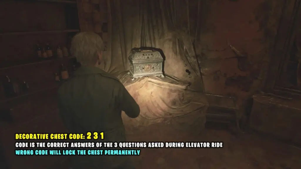 The decorative Chest is located inside the pharmacy on the 2F Level. To open the decorative chest with Code 231 for all difficulty level.