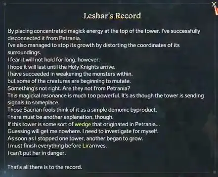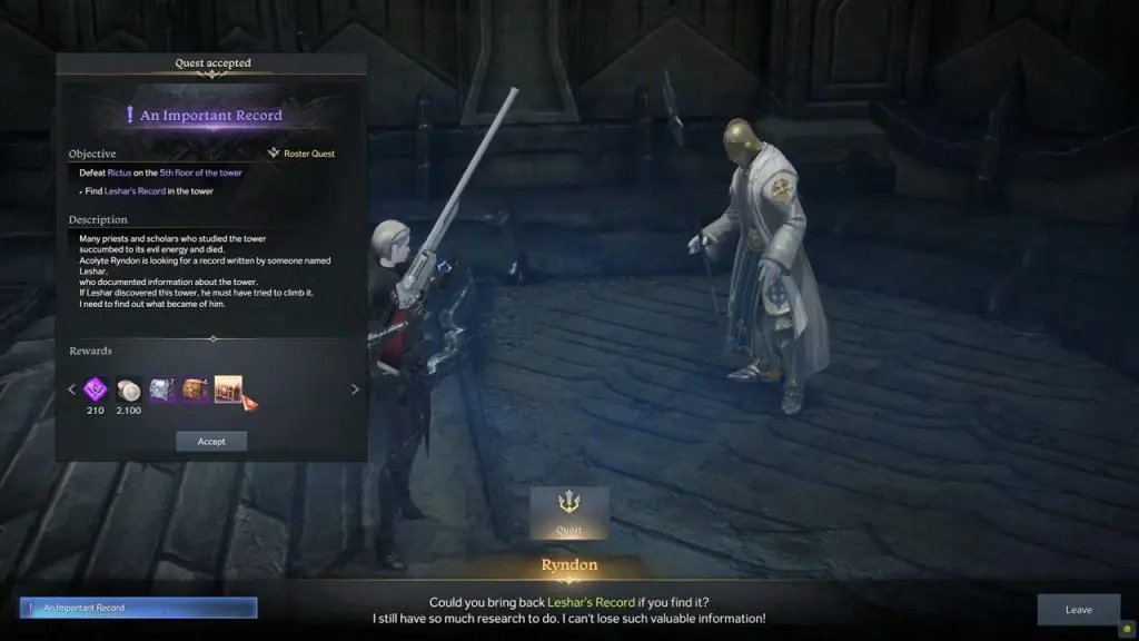 To start the quest, head to Shadow Island and speak with Ryndon (NPC) to initiate the quest – “An Important Record”. Ryndon will ask you to defeat Rictus on the fifth floor of the tower and bring back Leshar’s Profile.