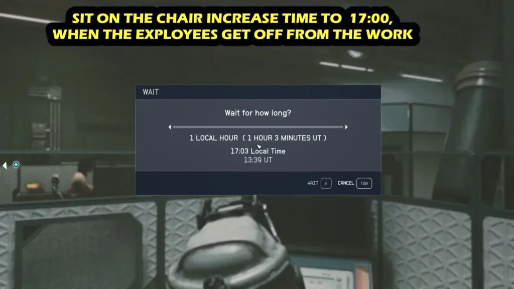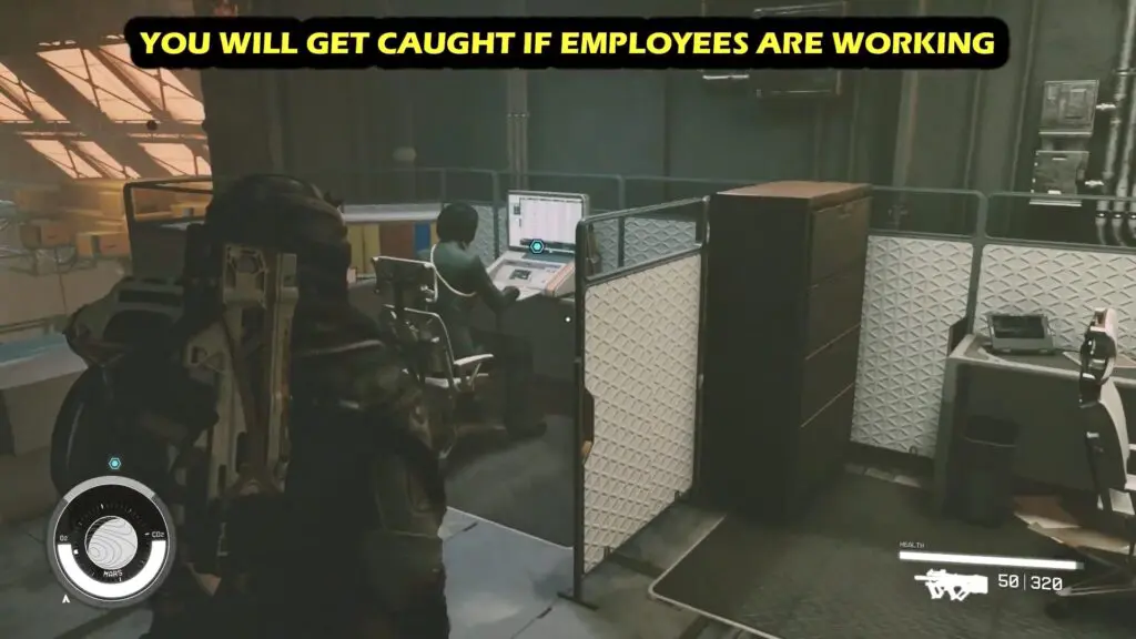 Go upstairs to meet Tia, who is seated on the HR computer desk. You will be caught if you try to interact with the HR computer desk if employees are nearby.