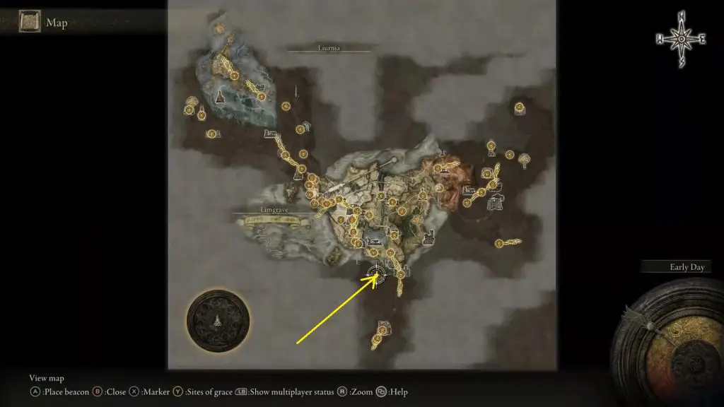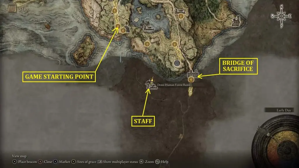 You will get Demi-Human Queen’s Staff in the Demi-Human Forest Ruins, which is in Weeping Peninsula as shown in the pictures below. Weeping Peninsula is south of Limgrave. When you first enter the open world in Limgrave, you arrive at The First Step site of grace as shown in the second picture below. From there, go southeast along the cliff until you reach the Bridge of Sacrifice. Cross the Bridge of Sacrifice to enter the Weeping Peninsula. Then go west to reach the Demi-Human Forest Ruins as shown in the second picture below.