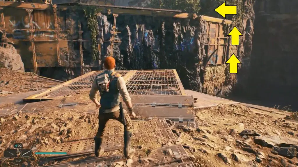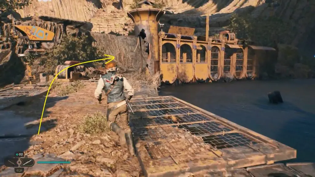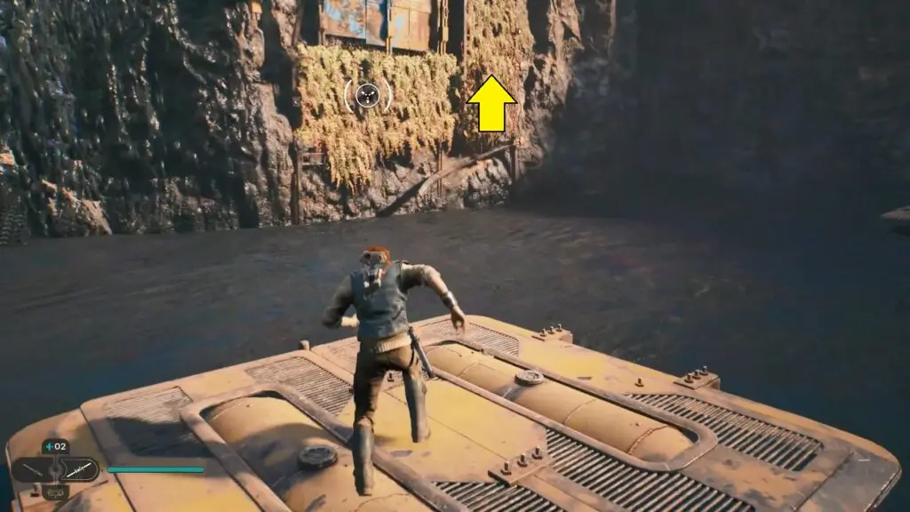 Jump on the platform floating on the tar-filled Derelict Dam and then climb up the wall with vines on the left.