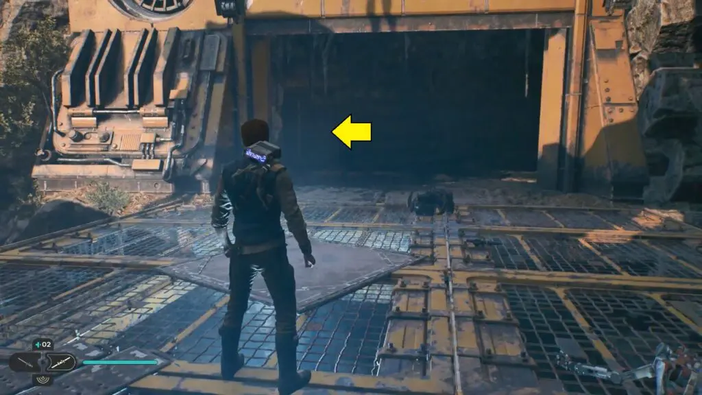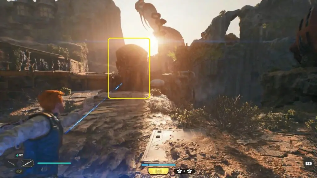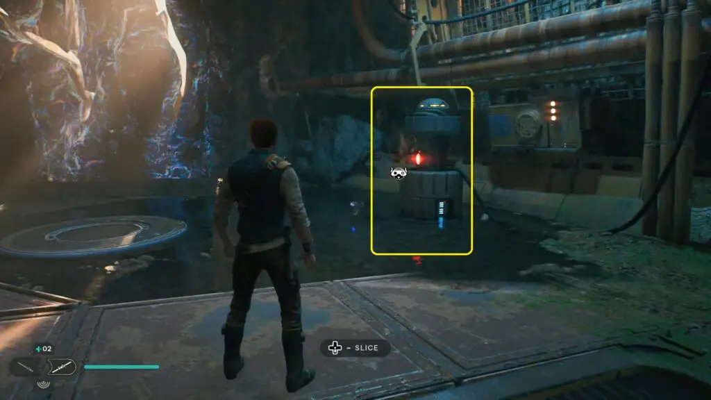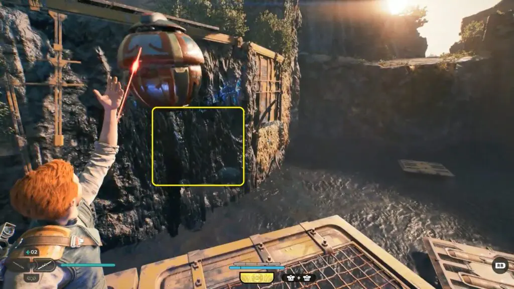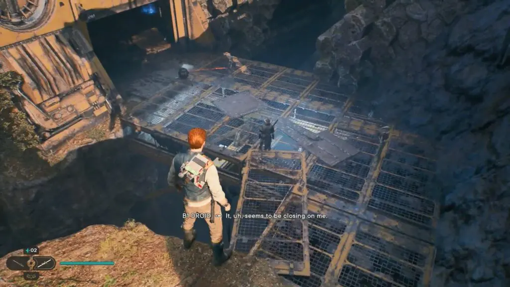 Eventually, you will spot the cave entrance below, where a Roller Mine is chasing battle droids and detonating. Descend and defeat all the enemies before entering the cave. When a roller mine begins chasing, the color of the laser changes. Blue indicates that they have latched onto Cal, yellow means it’s dangerous, and red indicates it’s about to detonate.