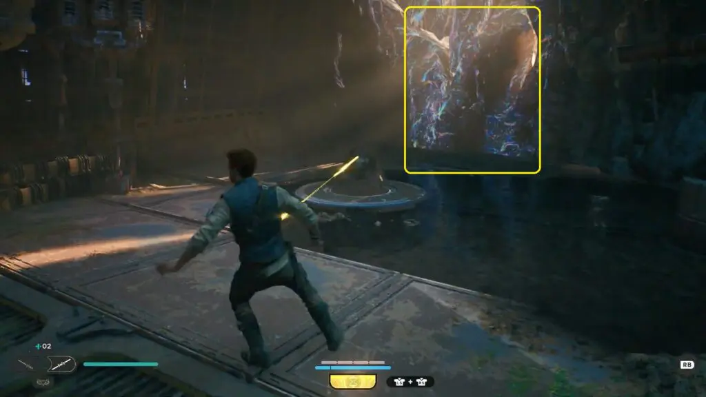 When BD-1 interacts with the mechanism, a Roller Mine will spawn and begin chasing you. You must use the Force Pull ability at this point to pull the Roller Mines and throw it toward the wall before it explodes. You’ll only have a few seconds before they explode in your face to toss them.