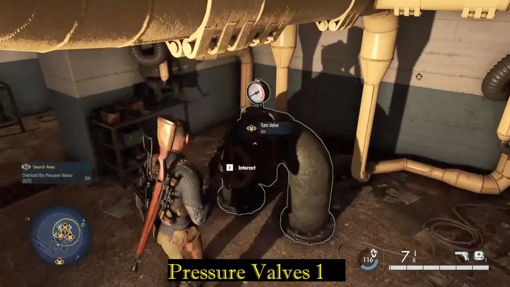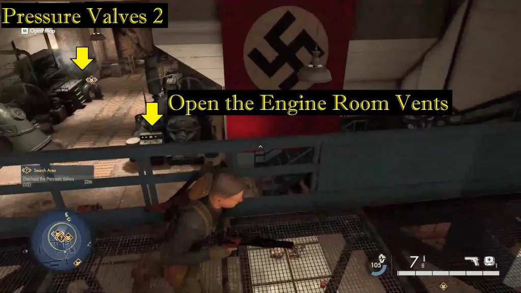 Your next goal is to overload the engine room’s two pressure valves. One of the pressure valves is in the adjacent room, while another is down a staircase in the same engine room.