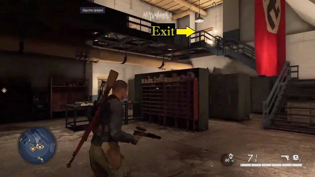 You will enter the engine room after passing through the corridor, which has Nazi flags hanging from the ceiling.