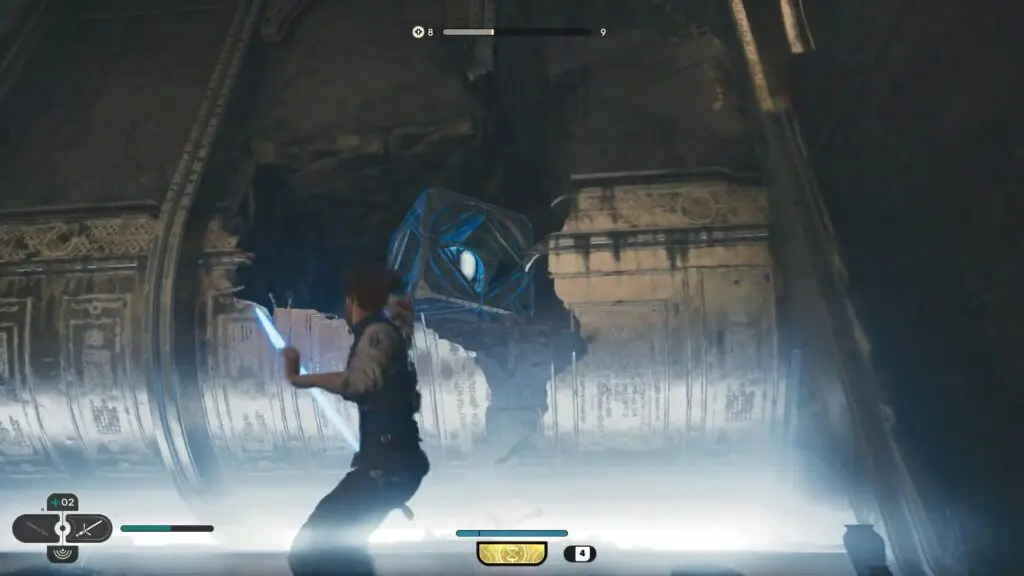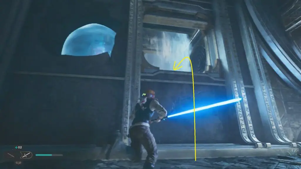 Here you will find an energy beam coming out of an orb amplifier, a Koboh Barrier, and a cracked wall. Force Pull the cracked wall to uncover an orb device.