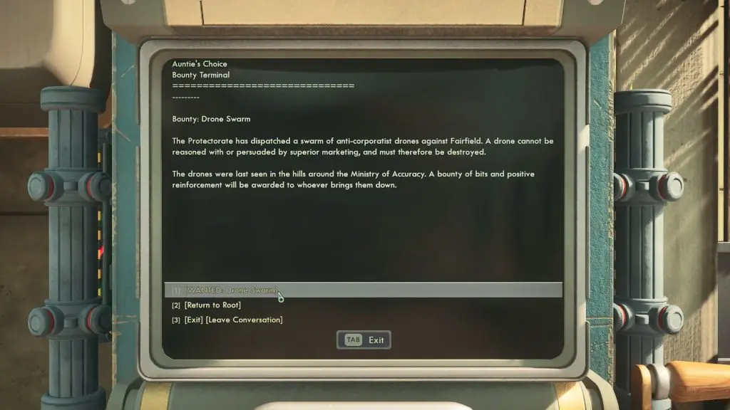 To begin the quest, head to the jail building after you arrive in Fairfield. It’s located just south of the big statue in the center of town. You’ll find a computer terminal outside the front door. Interact with it and select “WANTED: Drones” to start the Diabolical Drones of Doom task.