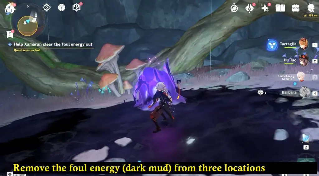 The giant mushroom will first ask for your help to remove the foul energy (dark mud). You’ll need to use your Lumenstone Adjuvant to clear out the Oozing Concretion bulbs in the three locations. I have marked the three locations on the map below.