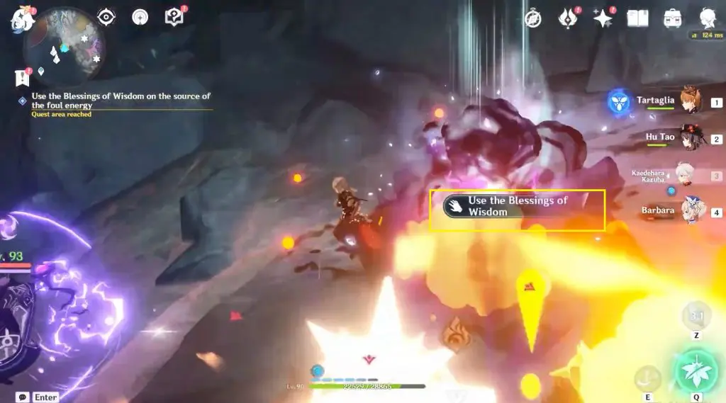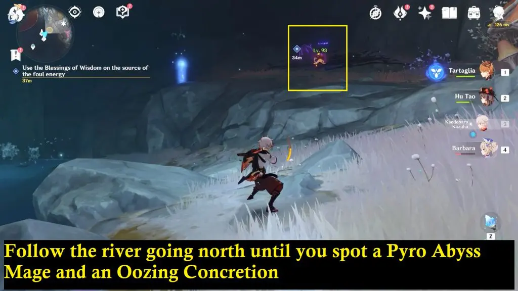 Defeat Pyro Abyss Mage and use “Blessing of Wisdom” on the Oozing Concretion to clear the source of foul energy. You will find a precious chest here too.