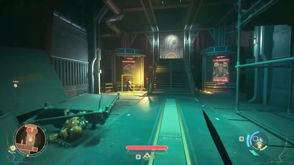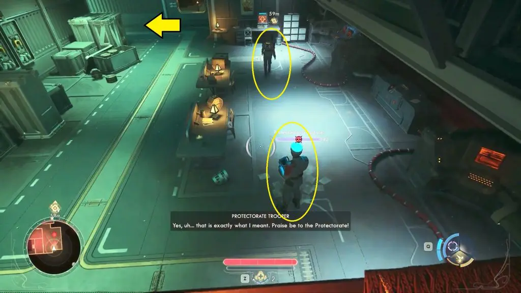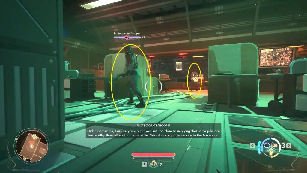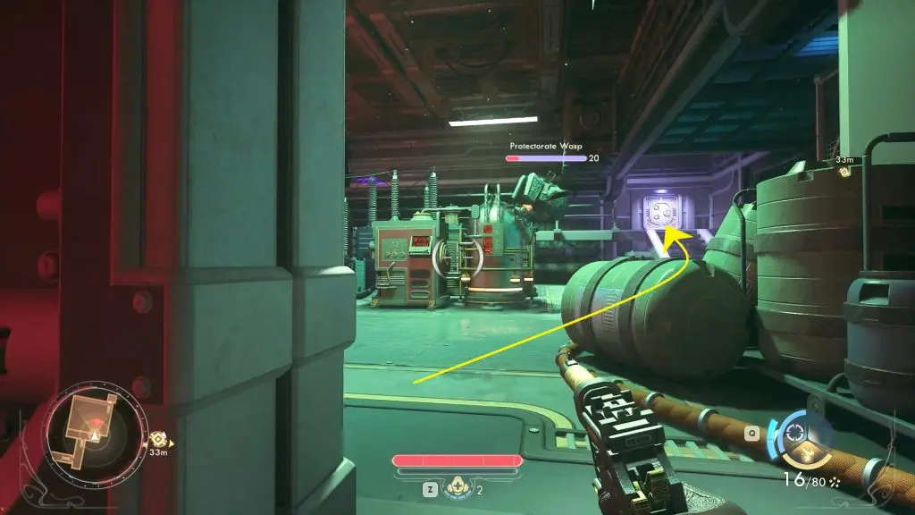Follow the path until you reach a room with a Protectorate Wasp patrolling the area. Wait for it to move to the far left side of the room before proceeding forward safely.