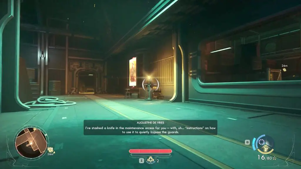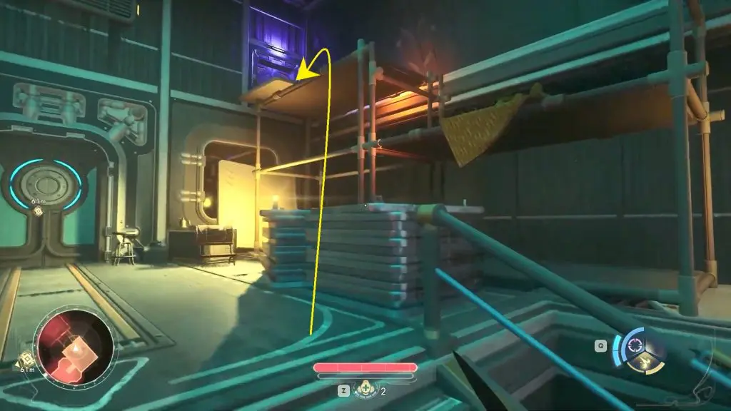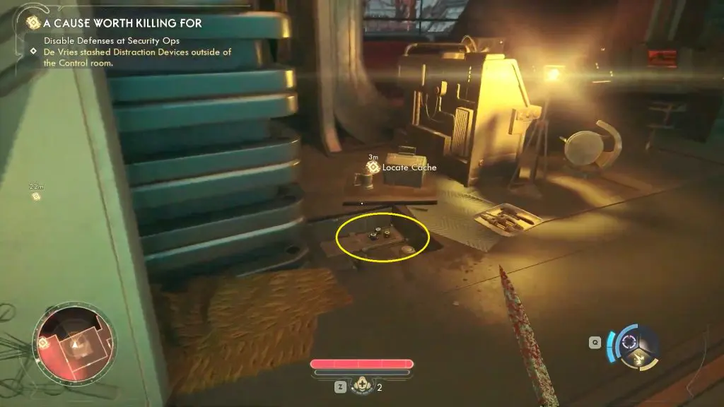 After taking down the guards, continue down the hallway and enter the room at the very end. Inside, walk toward the scaffolding and look around the floor area. You’ll find a Distraction Device to make it easier to sneak past or ambush the guards in the next room.