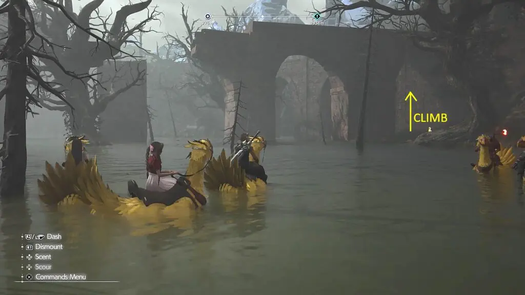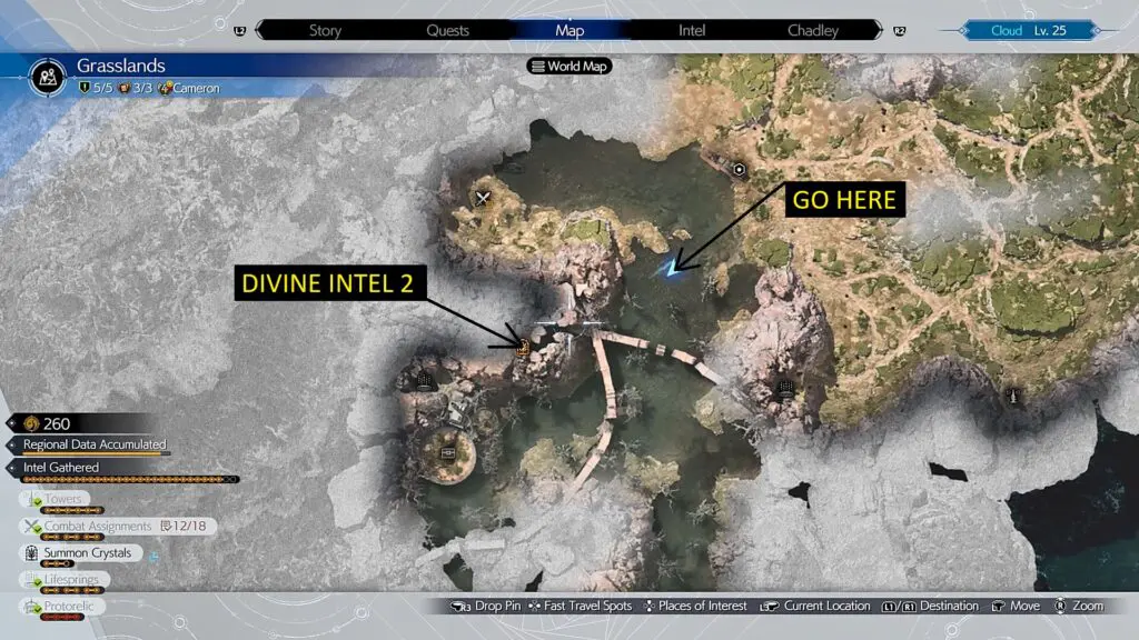 This guide shows how to reach and complete the Divine Intel 2 Titan Sanctuary B in the Grasslands region in the Final Fantasy 7 Rebirth game, which released on 29th February 2024. Mount a Chocobo and swim through the swamp to reach the broken bridge at the location shown in the picture below.