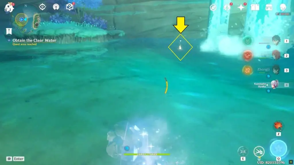 Once inside the cave, you can fight off Hydro Hypostasis. There are many sparkles in the water, but not all of it is good. The sparkling water in front of the waterfall is the clear water with which you must interact.