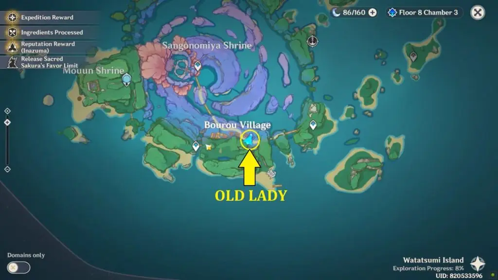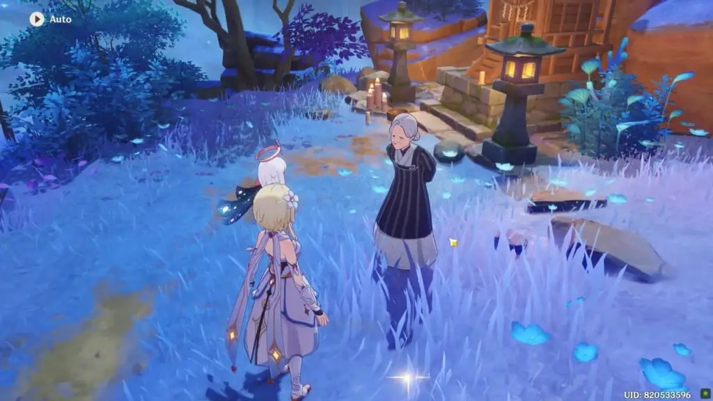 To get this world quest you need to speak to the old lady (NPC Komaki) in Bourou Village. Head to the southern part of Watasumi Island, you will find an old lady name Komaki near one of the houses in Bourou Village. She will ask for your help in getting water from the shrine’s Offering Pool.