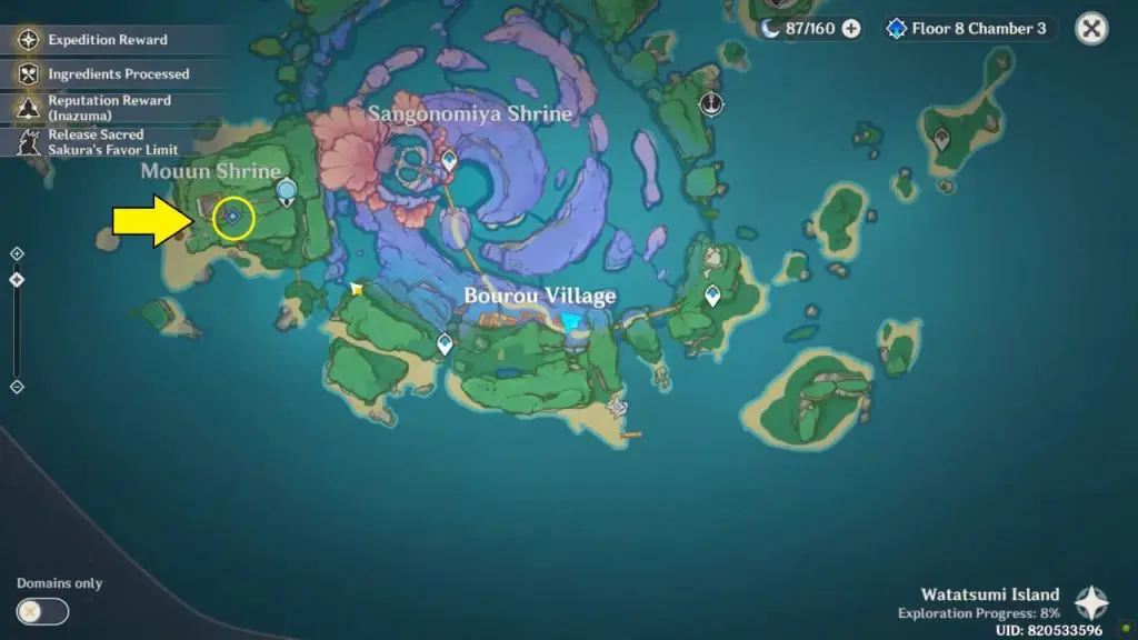 As the quest starts your first objective is to visit Mouun Shrine as marked on the map. The shrine is located on the western part of Watasumi Island. At the shrine, you’ll see a sparkle at the little well.