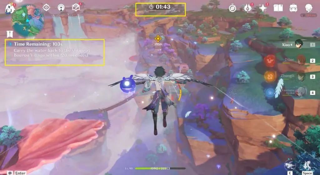 You’ll have to carry the water back to the old lady after you’ve collected it from the well. You cannot use fast travel to the nearby waypoint; instead, you must run back and glide back to the old lady in time. You’ll have 120 seconds to complete the task. Simply run towards the marker and glide off the cliff’s edge.
