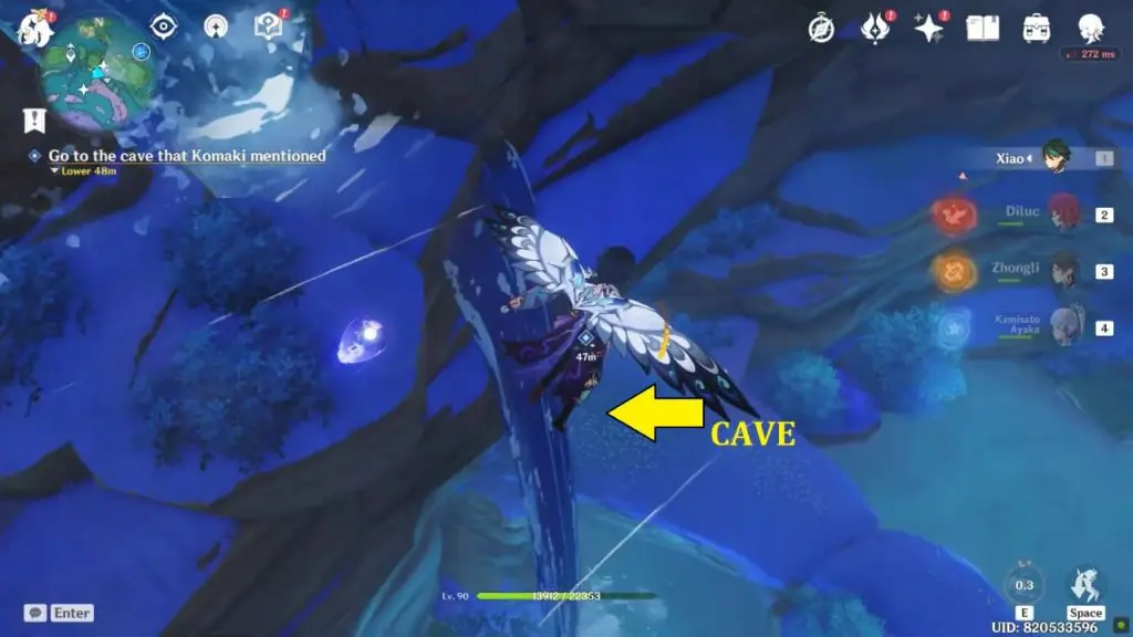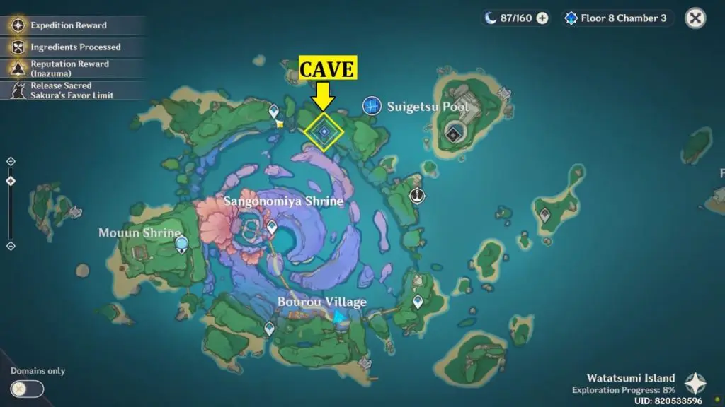Now your next objective is to visit the cave. The cave is located on the northern side of Watasumi Island. The door of the cave is on the cliff’s wall. You can fast travel to the nearest waypoint and glide down to the cave. The mouth of the cave is near the bottom right next to a waterfall.