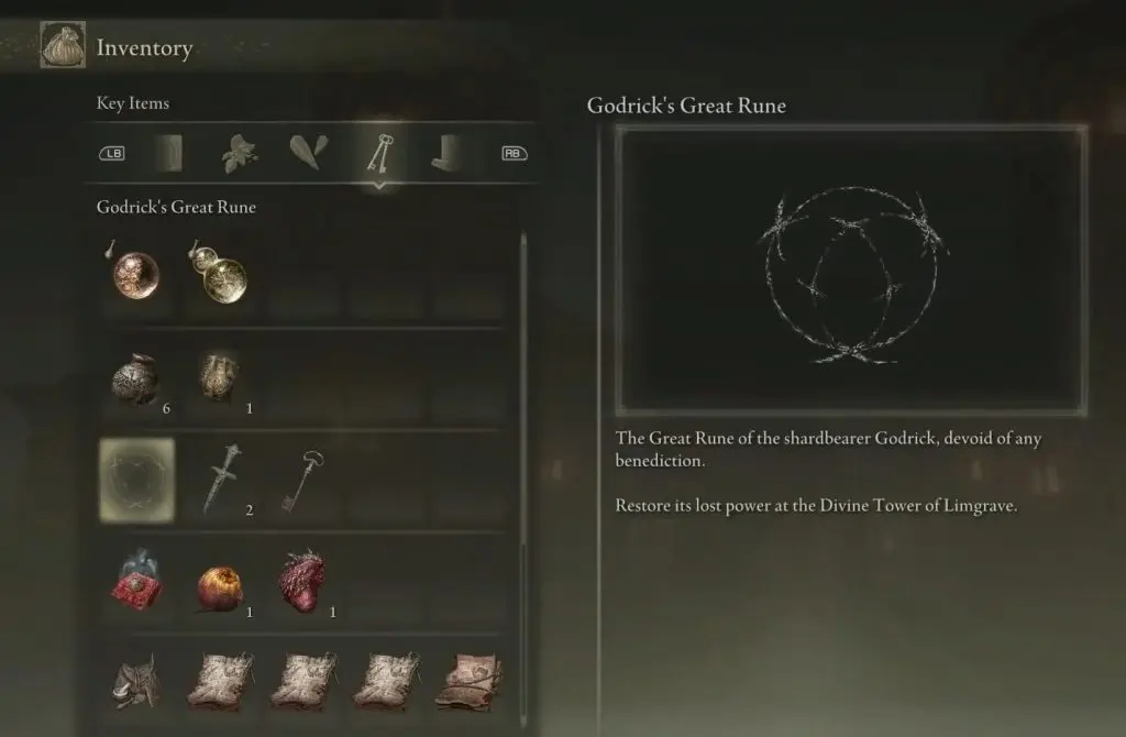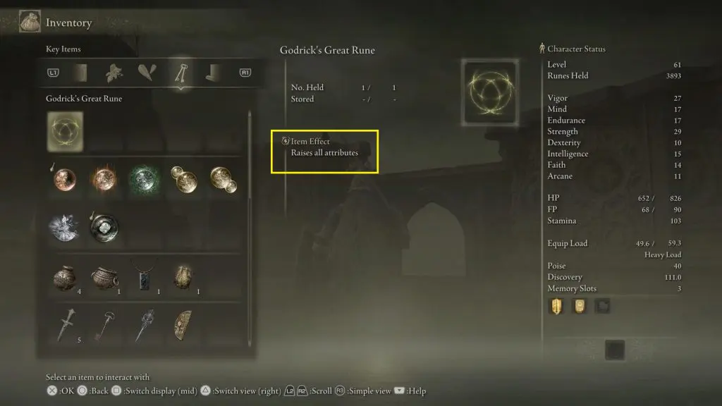Now when you see Godrick’s Great rune in the inventory, you will see that its power has been restored. It raises all attributes.