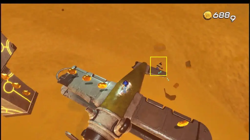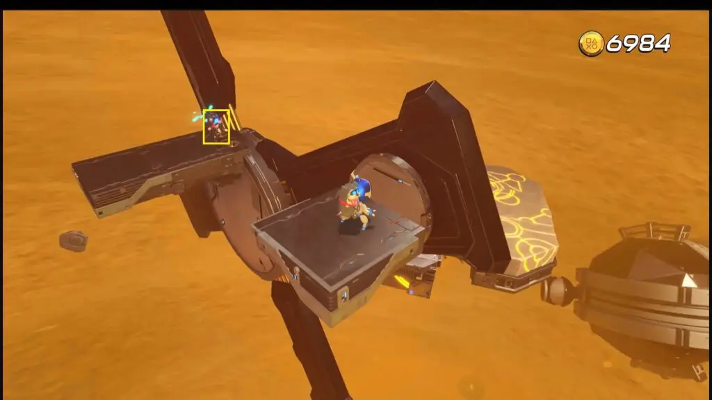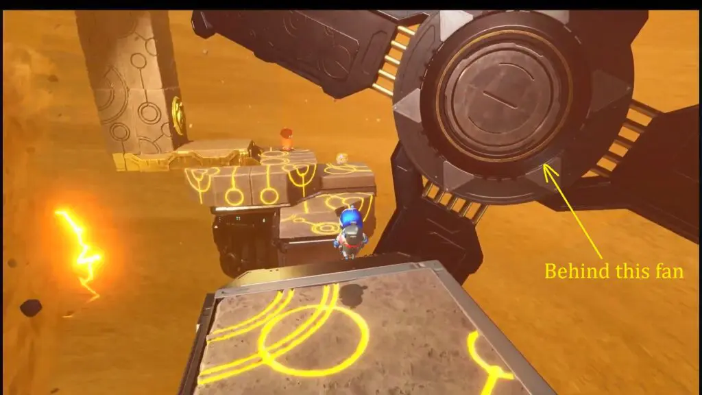 The next bot is on the backside of the big fan blade platform. Go around to the other side of the fan, then jump onto the platform connected to the fan blades to reach the bot.