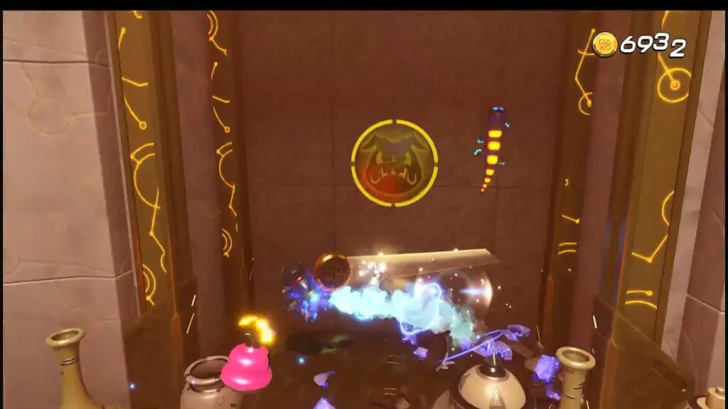 Keep going and cross the spinning platform. Break the pots to find the puzzle piece hidden in one of them.