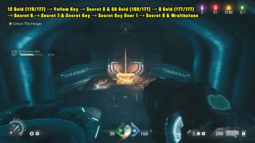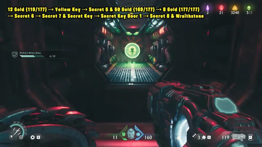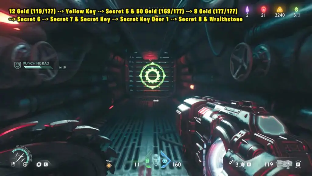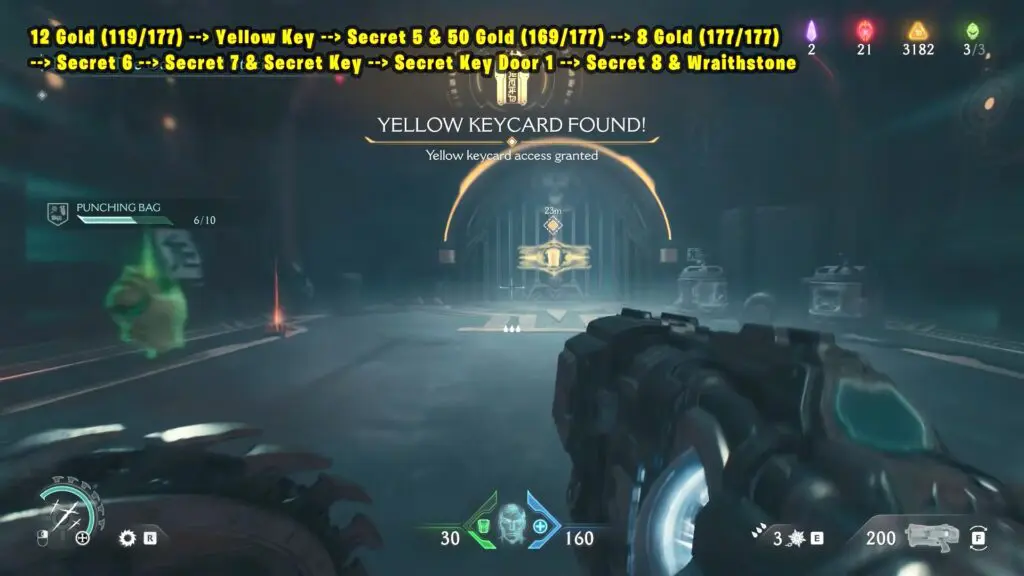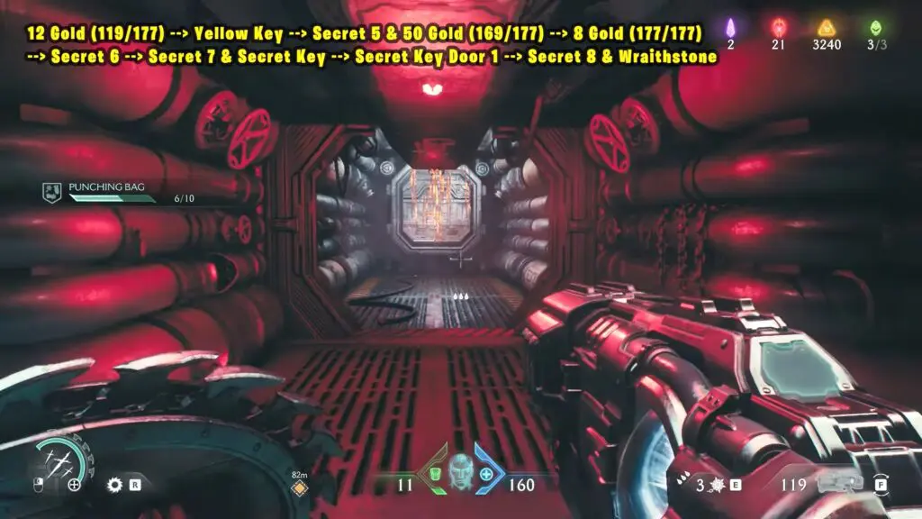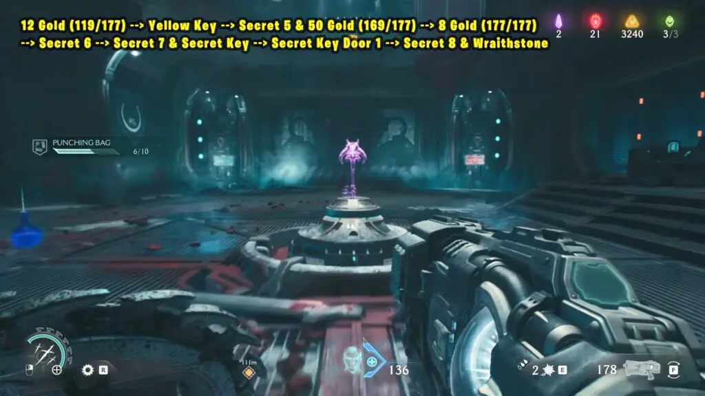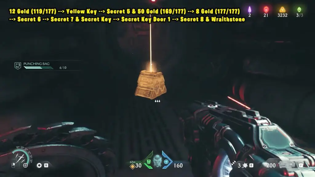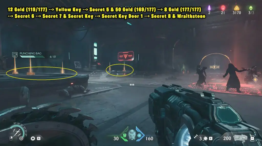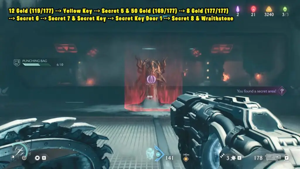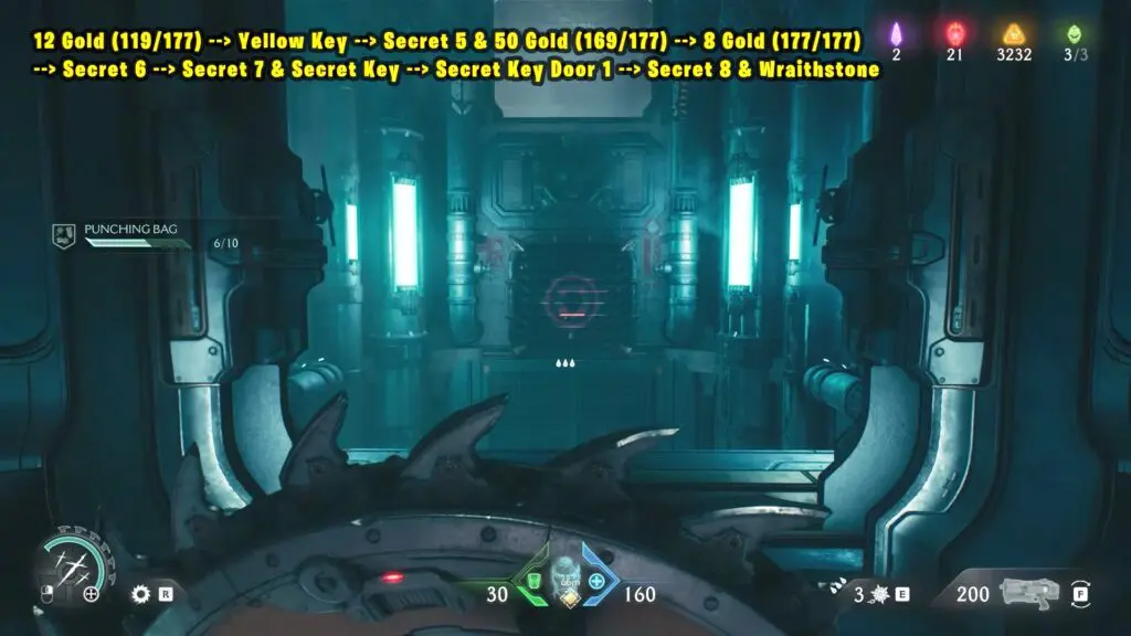 12 Gold (119/177) + Yellow Key + Secret 5 & 50 Gold (169/177) + 8 Gold (177/177) + Secret 6 + Secret 7 & Secret Key + Secret Key Door 1 + Secret 8 & Wraithstone