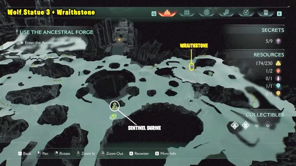 Go north from the Sentinel Statue to find the Wraithstone, which is covered by a shield. Look up to your right to see the third Wolf Statue. You can break it by throwing your shield.