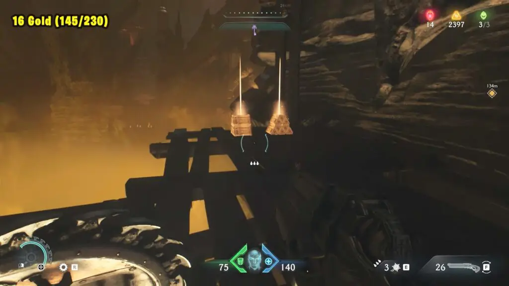 From this location, drop down from the ledge. Turn around and look for a blue gear. Throw your shield at it to make the platform go up. This will let you jump over to a chest with 50 Gold on the left.