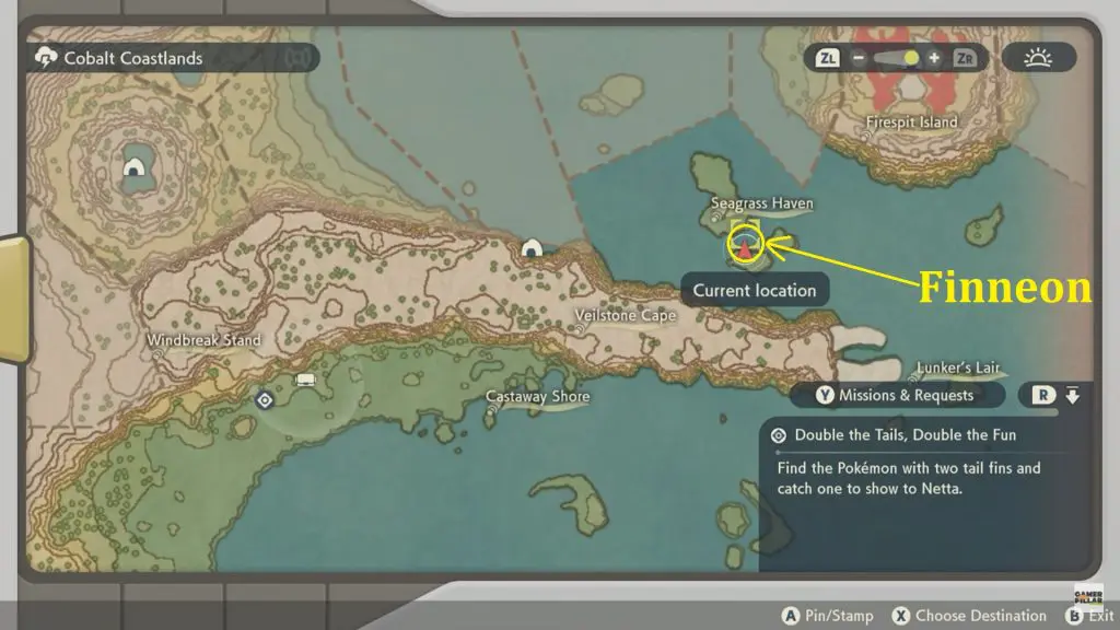 Finneon is a Water-type Pokemon. You can find a Finneon while swimming over by Seagrass Havens in Cobalt Coastlands. I have marked the location on the map. This is the only where you can discover Finneon in Pokémon Legends