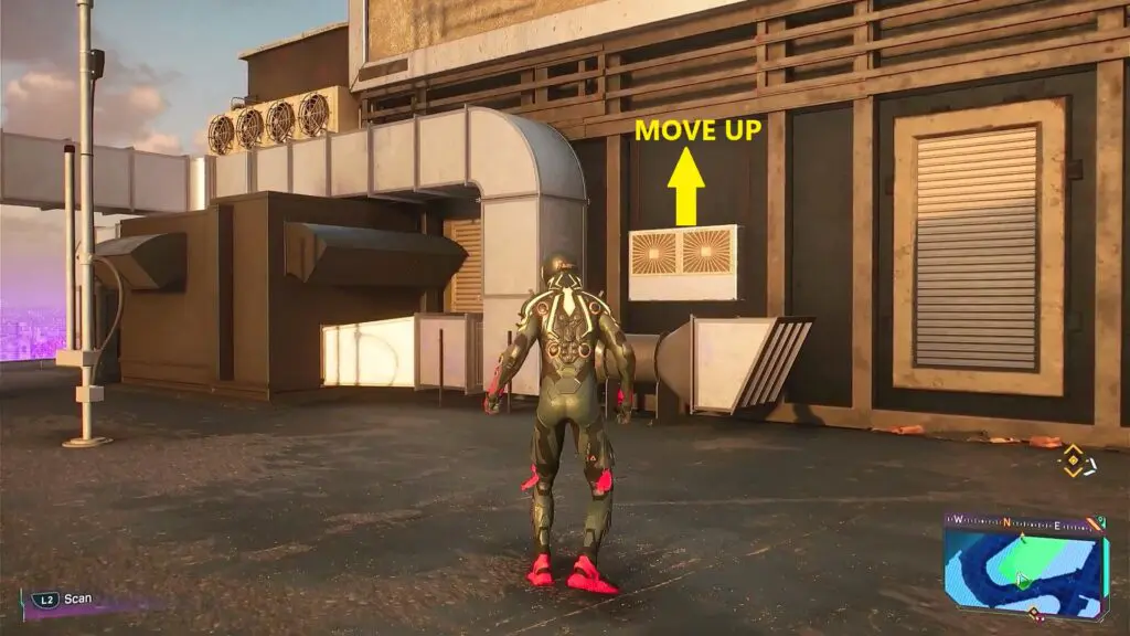 Go to the roof of the Building as shown in the picture below. Scan the panel there as shown in the second picture below and then stabilise the code by holding the yellow circles inside the grey boxes. Now climb up the antenna and press L1+R1 to pull up the panel, revealing a vent.