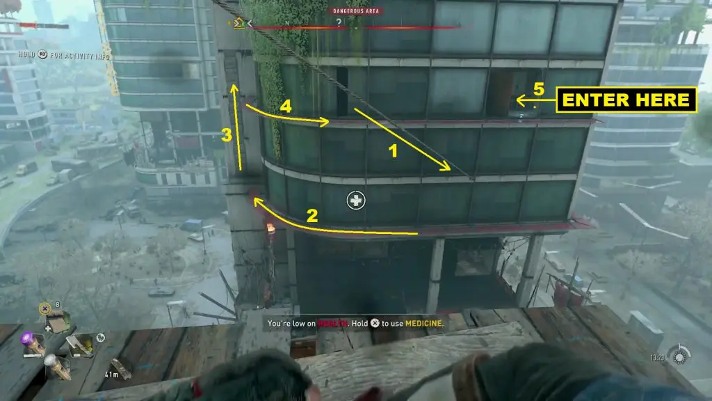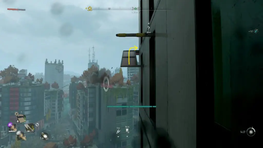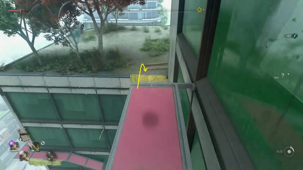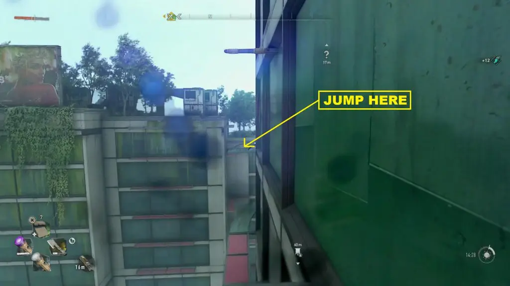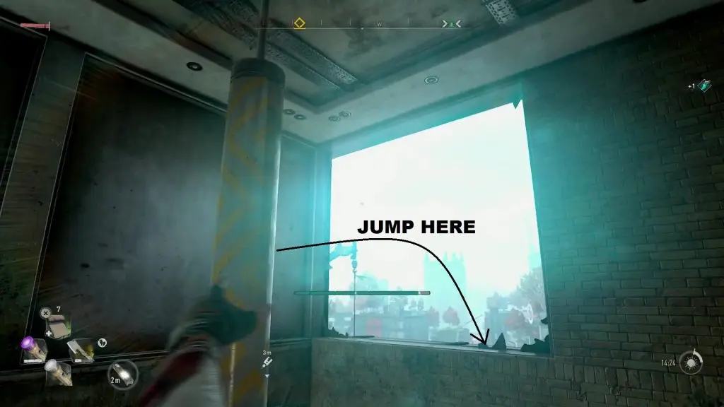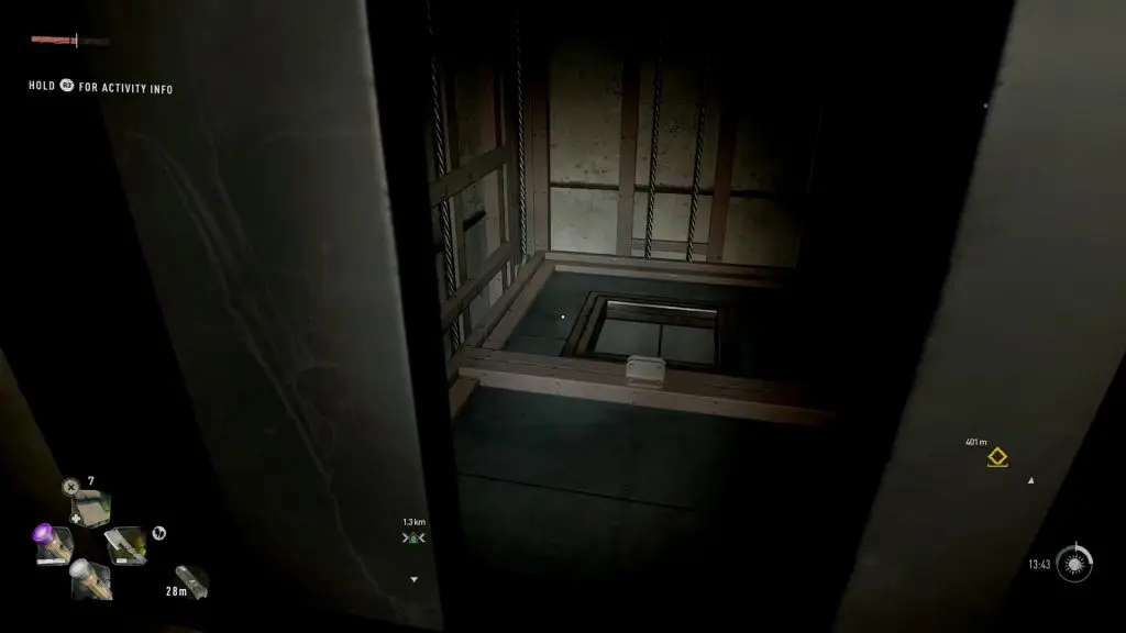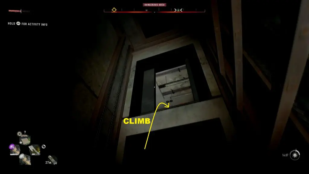 After entering the building, take the stairs to the upper level. On the upper level, you will find an elevator shaft. Enter the elevator shaft and climb further up as shown in the pictures below.