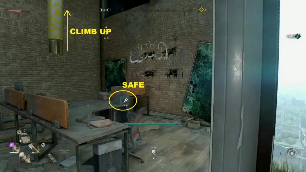 After climbing through the elevator shaft, you will come out on a roof. Climb up the wall as shown in the picture below to reach the safe.
